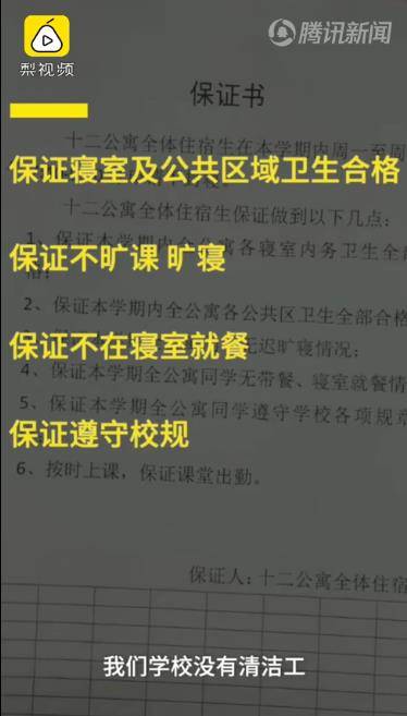 不過,該校學生也表示説,寫下保證書的十二公寓宿舍內自帶衞浴室,比較容易完成保證書中的要求;但是其他公寓是公共衞浴,“我們學校沒有清潔工,公共區是我們自己打掃,廁所走廊是我們自己打掃”,往往情況是前腳才剛打掃完,後腳又髒了,很難完成保證書中的要求。