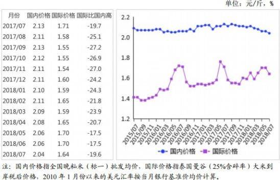 以2017年為例,國際上的米價每斤在1.3~1.8元之間波動,其他時間波動得更狠。而國內的米價較為穩定地維持在一斤2.1元左右,在很長一段時間內,是一直比國際價格高出一大截的。