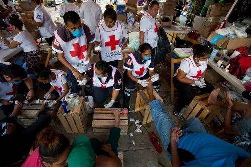 10月26日,在墨西哥南部阿里亞加,紅十字會志願者為移民治療腳傷。新華社/美聯