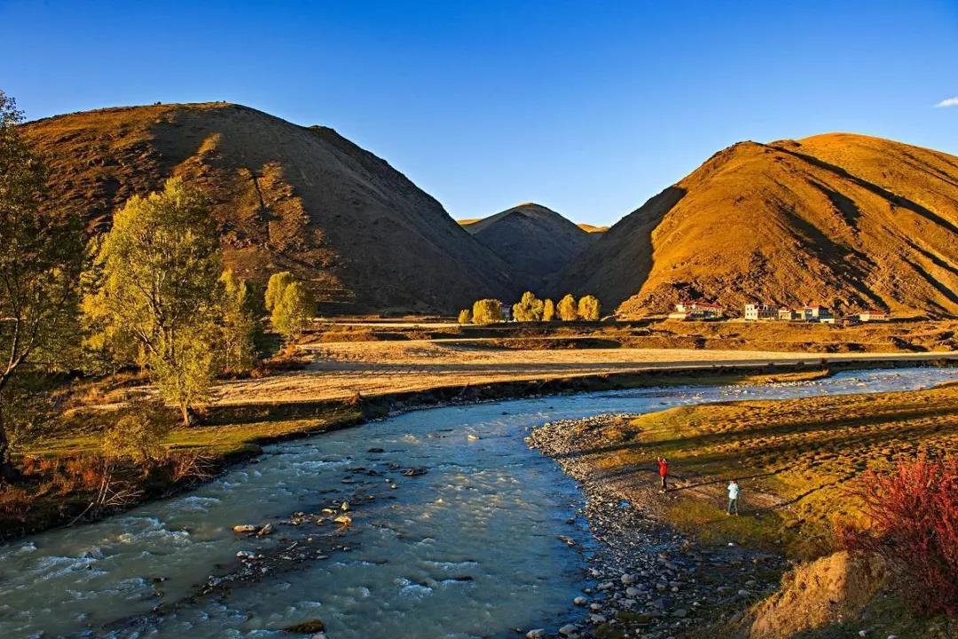 連綿起伏的山巒,一望無垠的草原,金黃的柏楊……,藏族山寨散落其中。