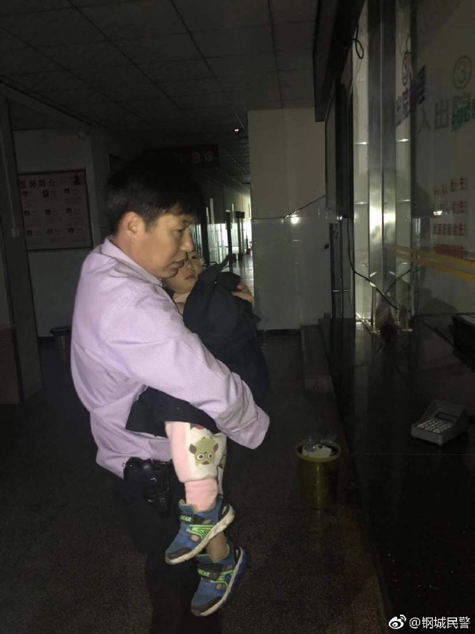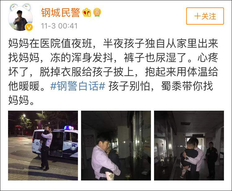 前天晚上,民警老白(微博**@鋼城民警**)在值夜班時發現了一個跑出來找媽媽的小孩子,他於是給孩子披上大衣一路護送他到了醫院值班的媽媽身邊。