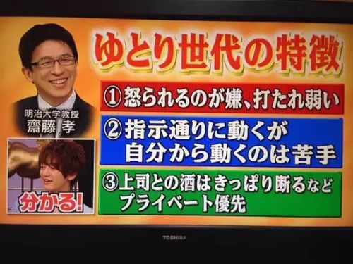 「行列のできる法律相談所」列出寬鬆世代的特點:1、無法接受責罵,承受力弱 2、沒有接到指令就不會自己行動 3、果斷拒絕上司的聚餐邀約,個人優先。