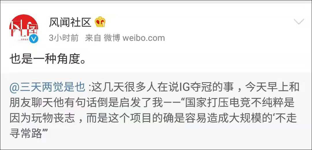 今天上午微博上名叫@三天兩覺是也 的博主發了一篇關於中國電競的微博,這篇微博的主要內容是他認為“國家打壓電競不純粹是因為玩物喪志,而是這個項目的確是容易造成大規模的‘不走尋常路”。