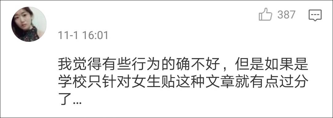 第一處是“讓她們學壞的原因,無非就是因為男人、愛情、學業”。一個“無非”,用詞語氣太過強烈了一些,而這也潛藏着校方的立場與態度。後面的“無非就是因為男人”也刺痛了很多人,這些人就已經對後面的“愛情”和“學業”選擇性失明瞭。本身發出這份通知的學校就不高明,“男人”這個詞怎麼也不適合與“愛情”、“學業”並列,而且難道“愛情”裏不就包含了“男人”這個層次嗎?