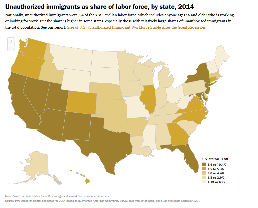 具體到數字,加利福尼亞是接受非法移民的大州,有235萬人,佔加利福尼亞總人口的6.0%,佔移民總數的22%,佔勞動力的9.0%;