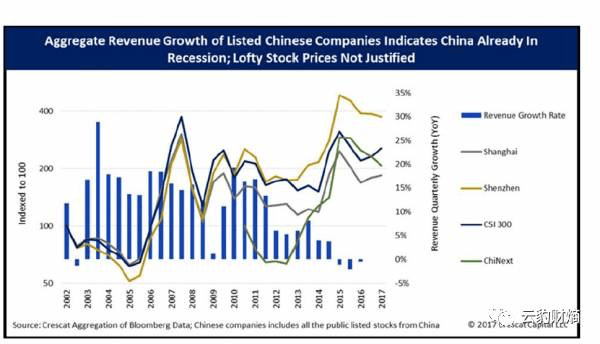 C國信貸泡沫在2015年末和2016年初就開始破裂了,如我們在上一份致投資者信中所示,Crescat 很好地利用了這段時期,而市場和大部分其他基金產品都在下跌。我們認為,它只是一場規模更大的崩盤的“前戲”。如下圖展示的四大A股指數,C國股市泡沫早在2015年就已見頂。這張圖還展示了,C國所有上市公司的總營收正處於連續第三年的負增長之中,近期GDP很有可能被高估了,並且經濟承受的壓力可能遠比多數國際投資者意識到的更大。換言之,隨着近期債務問題爆發,巨大的不良債務和虧損公司的問題可能只會越來越糟。