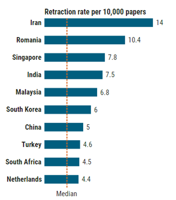 絕對數量上,由於中美兩國科研投入最大,因此撤稿數也是前兩名。而按每10000篇稿件中有多少篇被撤稿來計算,中國排在第七位,撤稿率達到萬分之五。