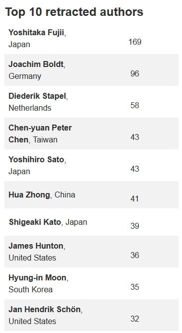 個人來説,中國井岡山大學講師鍾華以41篇被撤稿位列前十。
