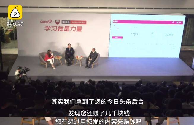 有問記者站起來,問了潘石屹這麼一個問題:“是否會用當大V發的內容和視頻賺錢”,並且還附上今日頭條後台的數據,上面顯示潘石屹在今日頭條上還賺了幾千塊。