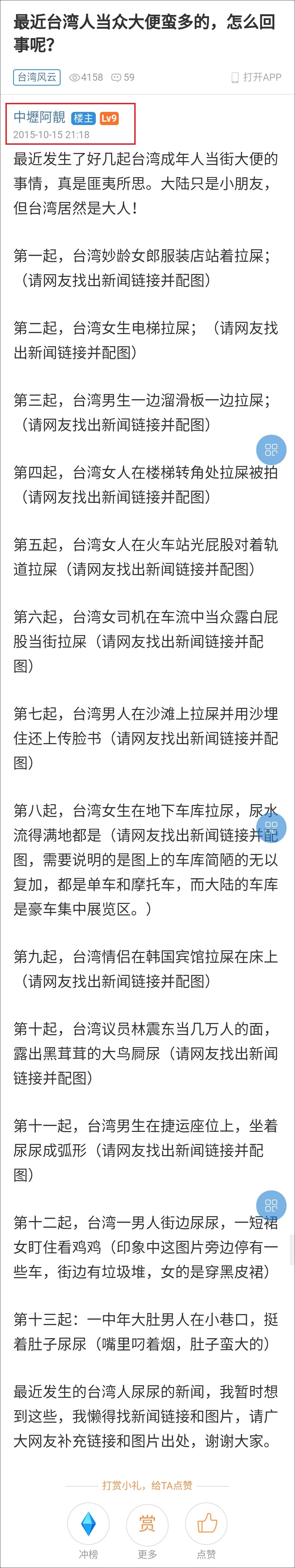 該網民稱,在此之後,牛仔褲大叔還跑到旁邊的樹叢中“當街解放”。這位網民表示,沒有想到自己會碰到這麼沒有素質的台灣人。