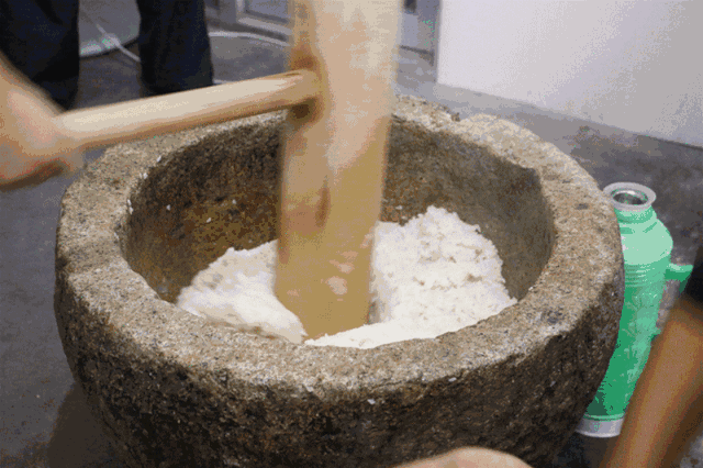 ▲舂餈的過程一般需要兩個人配合,才能把糯米舂得均勻滑嫩。