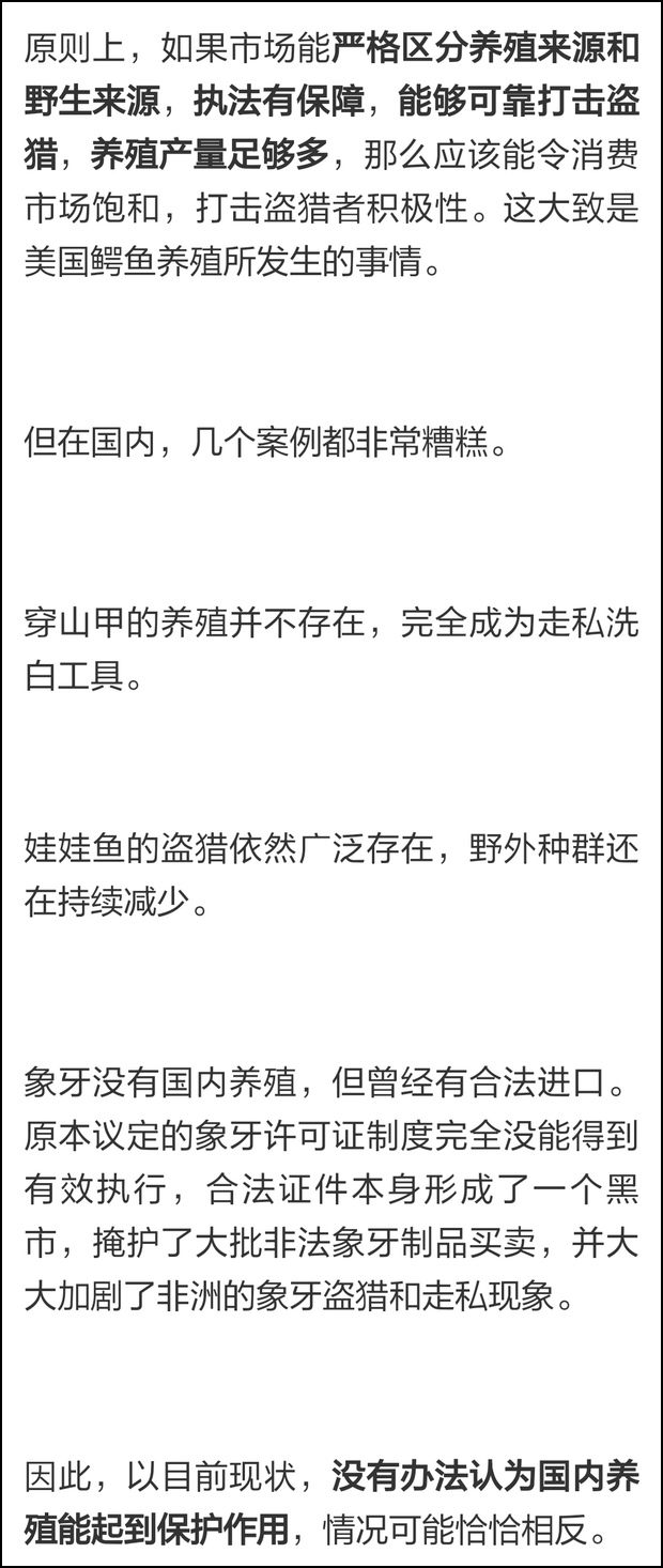 但科普界並不認同。果殼撰長文指出,人工繁殖對於保護野生動物並不管用,養殖難以拯救瀕危。