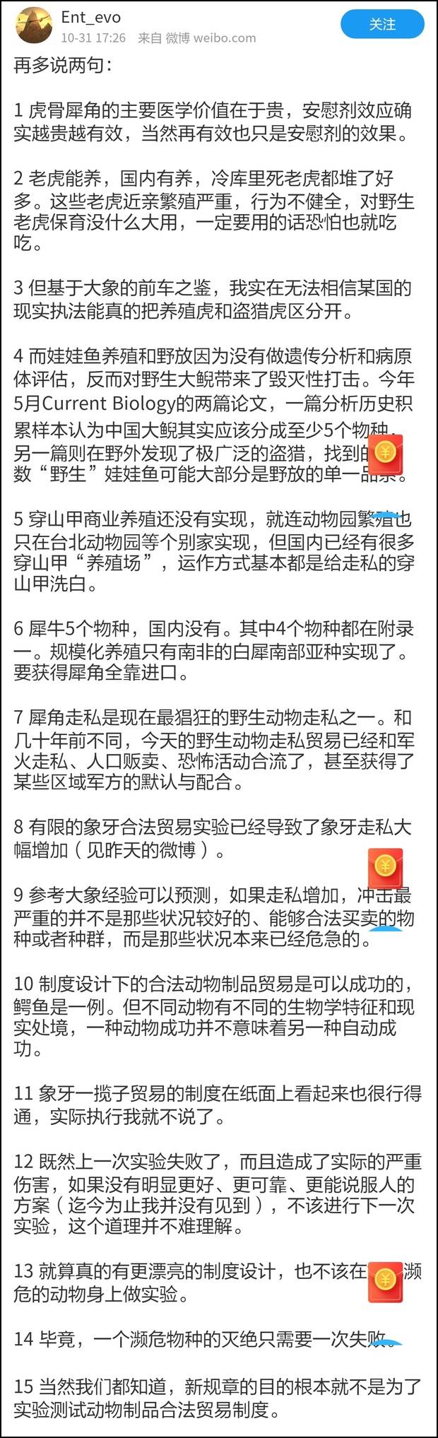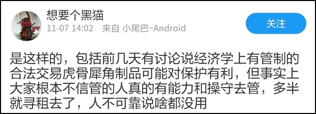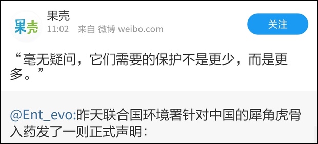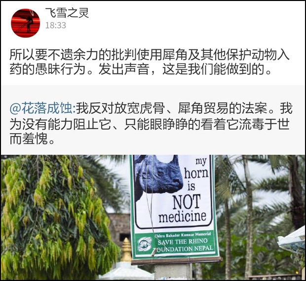 果殼網主筆、科學松鼠會成員@遊識猷 也撰長文指出,相信“藥用價值”的人,往往也相信“野生動物的藥效好過人工養殖的藥效”,即使合法養殖,也無法阻擋消費者們對“更好的野生品”的追捧。此舉將給本已瀕臨滅絕的老虎與犀牛帶來滅頂之災。