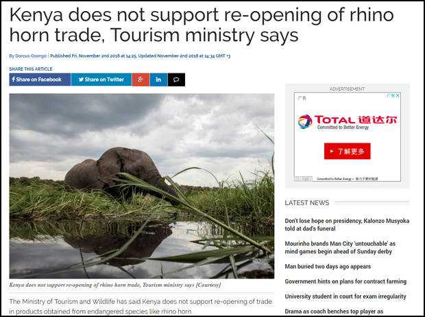 犀牛棲息地之一肯尼亞也向我國表達不支持。肯尼亞旅遊部於當地時間11月2日發佈聲明稱,作為國家,肯尼亞的立場是犀牛角貿易不應合法化。