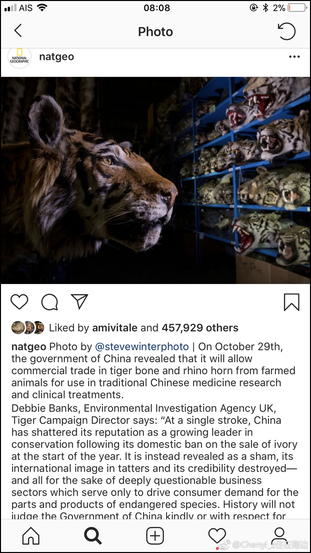 一連幾天,美國國家地理雜誌都在ins上對我國的新政策冷嘲熱諷,與偷獵新聞的報道夾在一起,並配上遭割角的犀牛與被害的老虎照片,引來了大量網民圍觀抨擊。