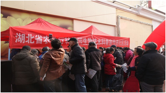 利用節假日、節慶日,先後在東湖植物園、凱樂花園、武昌區水果湖步行街、鋼都花園中百倉儲、漢口崇安新城、洪山公園、南湖沃爾瑪、黃岡遺愛湖等地開展轉基因科普宣傳,張貼轉基因科普宣傳畫,分發轉基因宣傳冊,贈送印有轉基因科普知識的撲克牌和環保購物袋,針對公眾關心的內容對轉基因技術、我國轉基因作物栽植情況、我國相關法規及管理等方面做了圖文並茂的闡述,同時通過專家解答積極同羣眾互動,化解老百姓的誤解,引導公眾不信謠、傳謠,理性看待轉基因,深受百姓歡迎。
