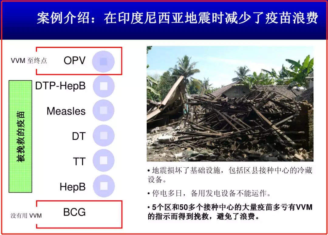 下圖中,印尼地震和海嘯導致接種門診的房屋毀損,疫苗冰箱或冷庫斷電多日。然而,因為疫苗上都加貼了VVM,通過肉眼判斷OPV(脊灰口服疫苗)的VVM中心方格的紫色深度至超過周圍的紫色,該疫苗必須報廢。其他5種疫苗的VVM雖然也有變色,但都沒有超過限度,這些疫苗都可以使用。BCG(卡介苗)因為沒有貼VVM,所以直接報廢。