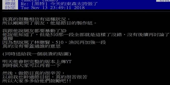 這位觀眾在PPT上發文“今天的東森太誇張了”,內文氣憤表示: