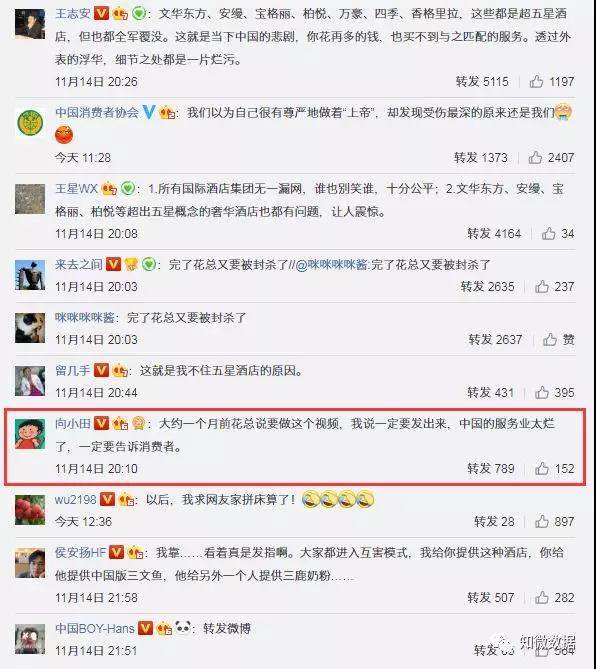 如此巨大的互動量從何而來?由於花總本身便是知名大V,早期也多次在微博上分享關於酒店入住的感受與測評,此次曝光微博獲得了@王志安 @王星WX @來去之間 @向小田 @wu2198 @侯安揚HF 等一眾大V的傳播擴散,其中@向小田 轉發時表示“大約一個月前花總説要做這個視頻,我説一定要發出來,中國的服務業太爛了,一定要告訴消費者。”