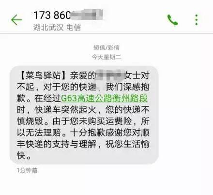 11月13日下午,安徽網友**@趙煩煩**發佈微博稱舍友收到一條短信,疑似來自菜鳥驛站,內容寫着“在經過G63高速公路南京路段時,您的快遞所在的快遞車因發動機温度過高不慎燒燬,由於您尚未購買快遞險,故無法理賠。”