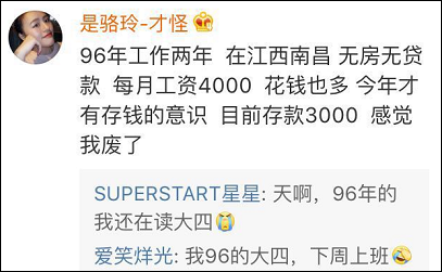 像這位96年的小姐姐,工作兩年,現在的存款也有3000了!兩年存了四分之三個月的工資了。但是這位已經算是優勝選手了,還有不少96年的年輕人還在上大四,還花着錢。這位工作兩年的旁友,至少自給自足了!
