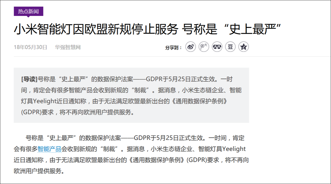 這對於注重個人信息保護的英國民眾而言是非常嚴重的行為,甚至是擴大到歐洲多國來講都是如此。自媒體“科技指南針”將其與Facebook泄露用户信息被嚴重處罰的事情相提並論,而且今年剛剛頒佈GDPR(歐洲通用數據保護條例)號稱史上最嚴格的個人數據保護法案。並且小米生態鏈旗下的智能燈Yeelight成為GDPR的祭器,因違反規定無法提供服務。