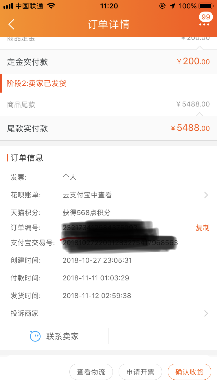 10月27日下單付定金,11日凌晨付尾款,12日凌晨顯示已經發貨,説預計13號送達。