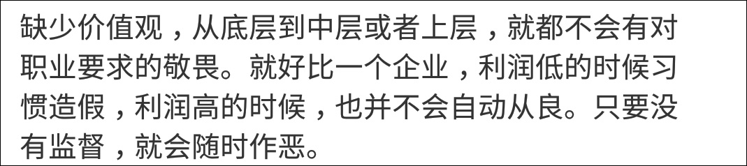 最後,王志安總結道,缺少價值觀,從底層到上層,就都會缺乏對職業要求的敬畏。就好比一個企業,利潤低的時候習慣造假,利潤高的時候,也並不會自動從良。只要沒有監督,就會隨時作惡。