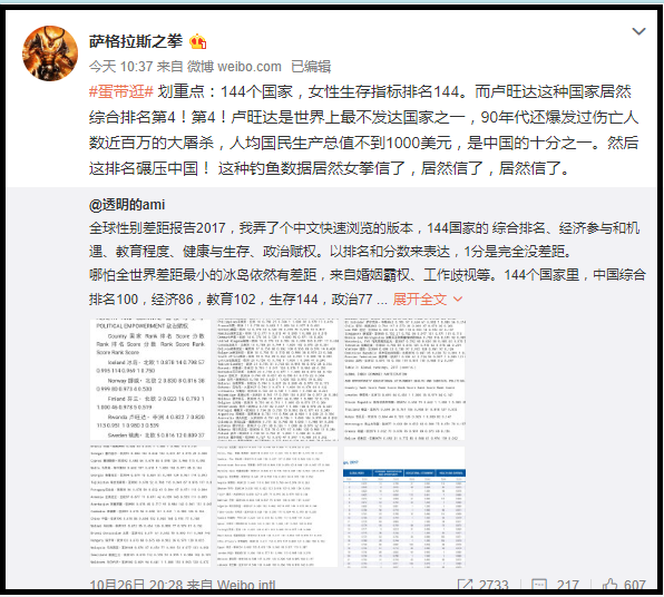 今天看到了這麼一條微博,來自用户@薩格拉斯之拳。博文中,他對全球性別差距報告提出了質疑,論點是“盧旺達這種國家居然綜合排第4!”