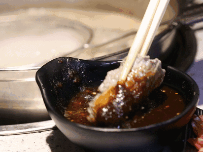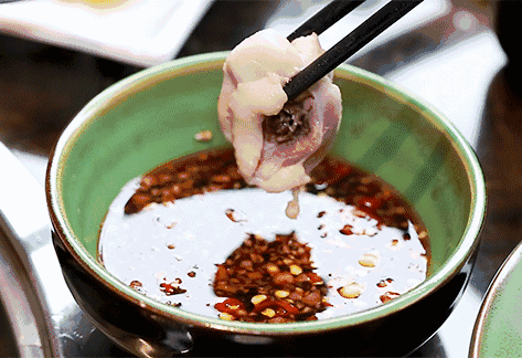 **油碟+幹碟,**雙碟合併的吃法,在川渝的火鍋餐桌上極為常見。羊肉、魚鮮等食材蘸入油碟可適當解辣,增加香味;而毛肚、黃喉、腰片、鴨腸等“齷齪”,滾落在幹碟裏,才能在最大程度保留原味的同時,豐富香辣口感。