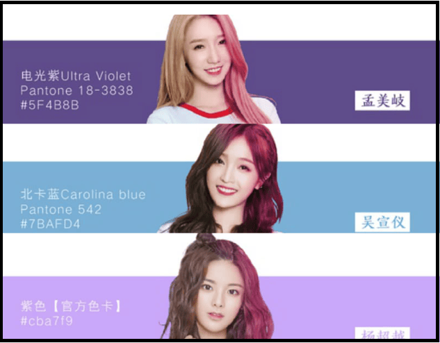 在偶像產業裏有這麼一種神奇的文化,叫應援。在粉圈裏,應援色這種東西是絕對不能撞的,不然就是兩個圈的超級大撕逼了。所以為了避免撞車,粉絲通常都會用少見的顏色作為應援色,有的還會專門附上特殊的名字。比如這樣: