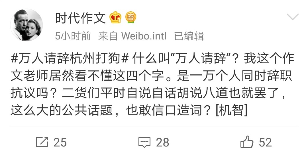 就是,#萬人請辭抗議杭州打狗#這個話題創設得讓語文老師都看不下去了。