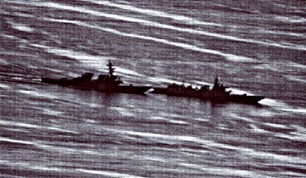 衝突現場蘭州號與美軍軍艦追逐的場景,其中右側為蘭州號,左側為美軍迪凱特號軍艦