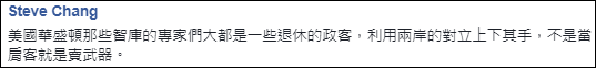 “美國智庫專家大都是一些退休的政客,利用兩岸對立上下其手,不是當掮客就是賣武器。”