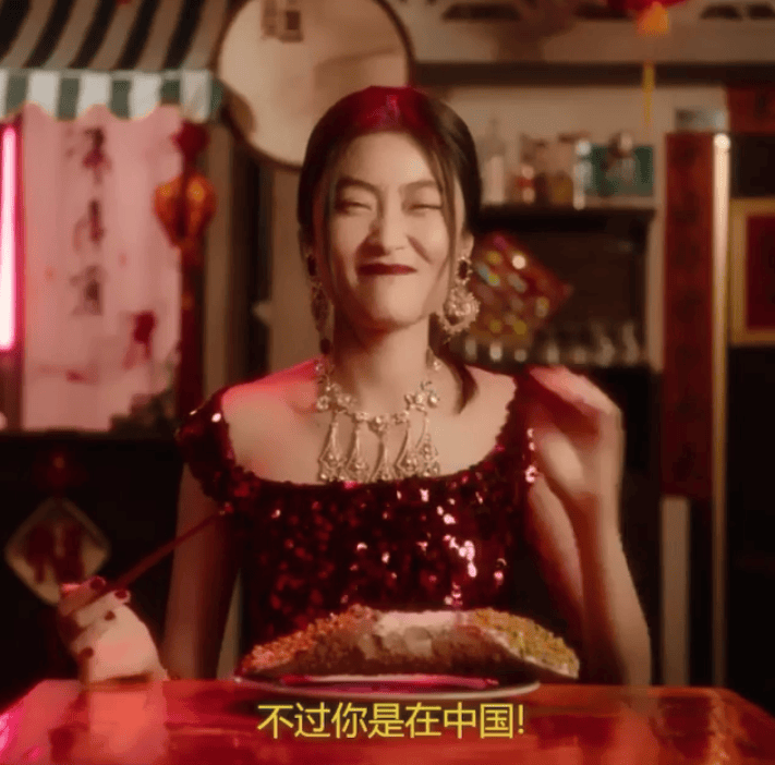 視頻的一開始就是穿着紅色亮片裙佩戴着各種珠寶的亞洲面孔的女子在一個類似於中國餐館的佈景中坐下來。
