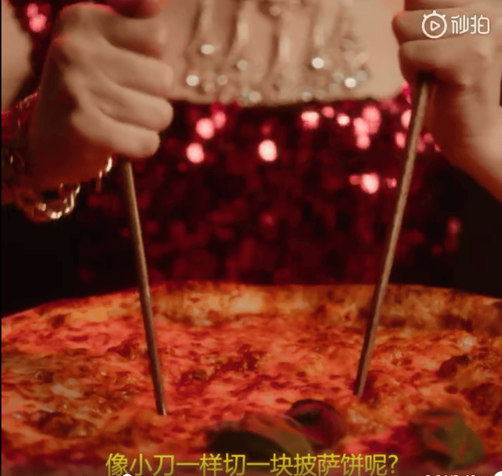 旁白表示:“你們是不是一手拿一根,像小刀一樣切一塊披薩餅呢?”
