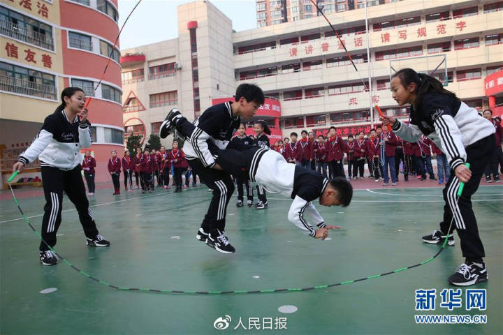 2017年,安徽淮北第二實驗小學“靈動花式跳繩隊”隊員在大課間為同學們表演花式跳繩。