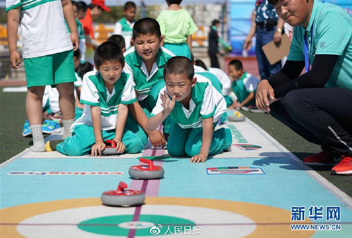 2018年,北京昌平十三陵中心小學學生在學校舉行的“冰雪嘉年華”活動中體驗地板冰壺。