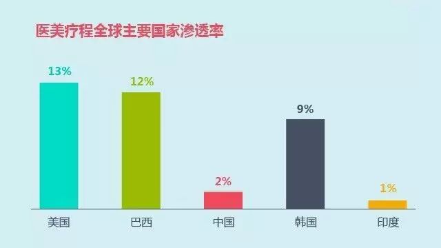 據《2017醫美行業營銷獲客白皮書》顯示,中國每千人接受醫美療程的僅1.7人,同比美國12.6人、巴西11.6人、韓國8.9人,遠高於中國。