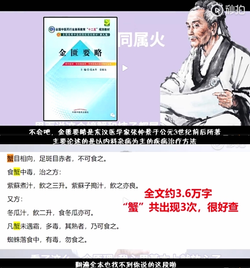 視頻中,田吉順稱,經過自己的考證,螃蟹和柿子不能同吃的謠言最早出現在《金匱要略》,源自中醫理論的“火火相剋”。