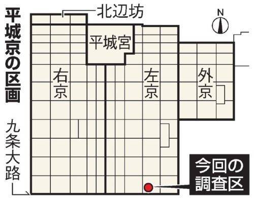 從7月下旬開始,奈良市埋葬文化財產調查研究中心調查了位於平城京南端的九條大路北側的3825平方米的區域(奈良市西九條町4丁目)。這裏是日本住宅綜合製造商大和住宅工業(總公司·大阪市)購置的建築用地,在建設新住宅前,大和住宅工業對此地進行了挖掘調查。