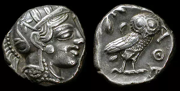 雅典娜和她的愛鳥貓頭鷹在古希臘的地位有多高呢?公元5世紀中期,雅典的城邦幣,當時最重要的國際通貨之一,就被設計成了正面雅典娜、背面貓頭鷹的樣子。這種貓頭鷹銀幣,作為古雅典文明的縮影,現在已經是全球最有價值的古錢幣。