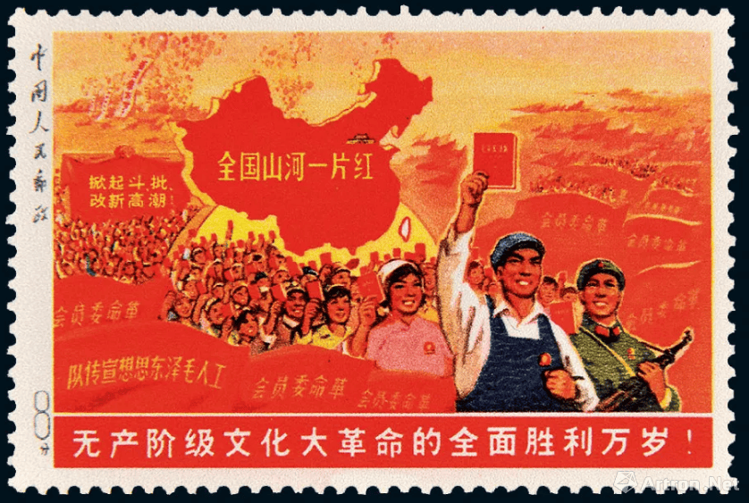 1968年9月,為“紀念無產階級文化大革命的全面勝利”,郵電部發行了新中國郵票史上知名度極高的三枚珍郵,即俗稱的“全面勝利”、“大一片紅”和“小一片紅”。此三版“文革”系列郵票存世數量極少,不過數百枚,均成為新中國郵票中的著名珍郵,併名列世界珍郵之列。其中“大一片紅”面值8分,票幅為60毫米×40毫米,存世僅見9枚,其中新票6枚,舊票3枚。
