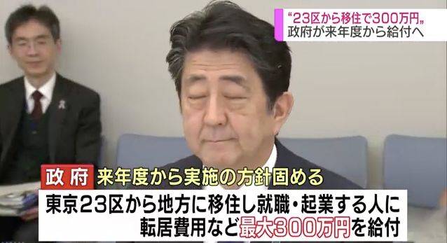 據《朝日新聞》,從東京23區遷往地方創業的人員,政府最高給予300萬日元補貼,而遷出之後在地方中小企業就職的人員,最高補貼100萬日元。