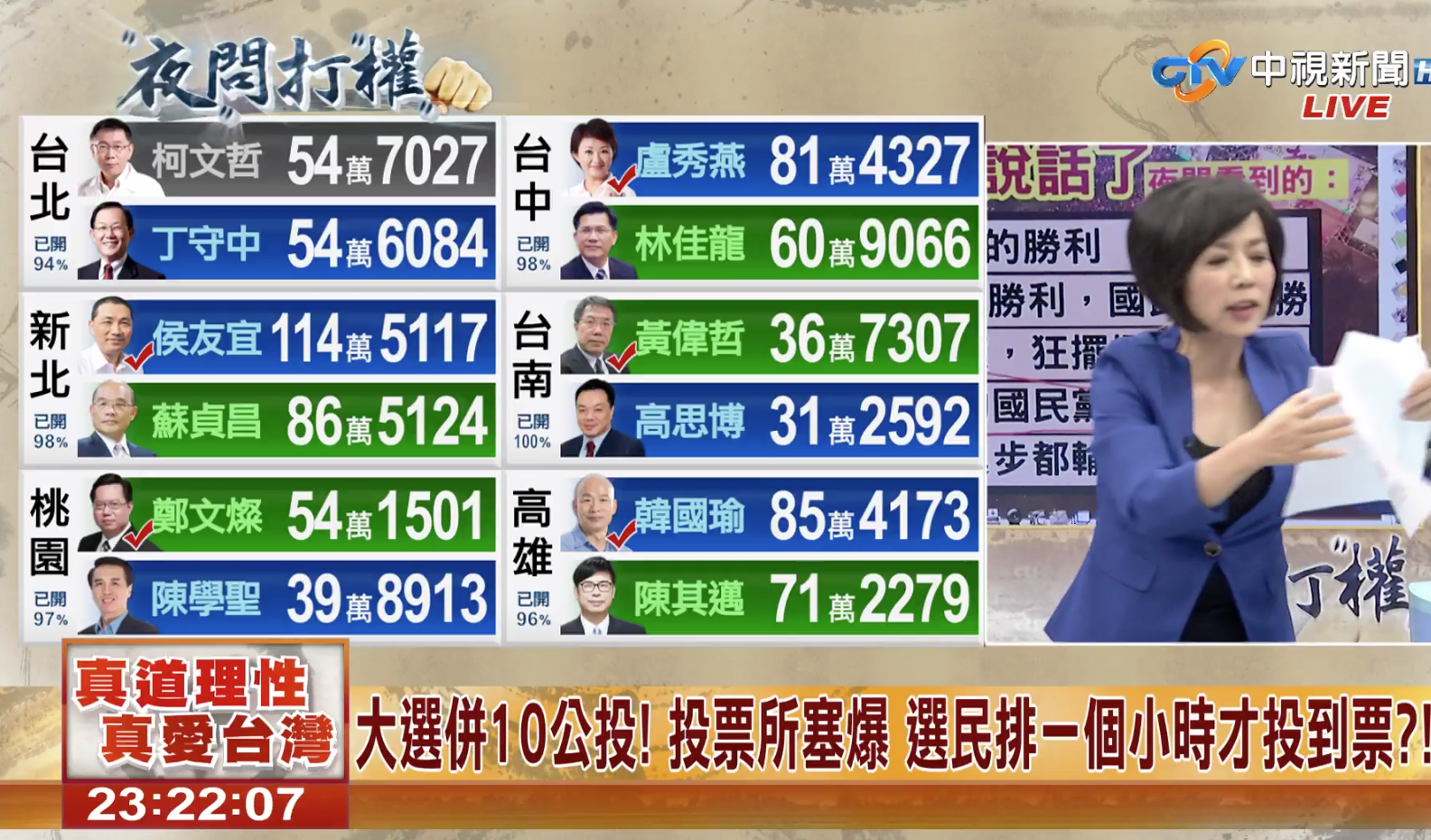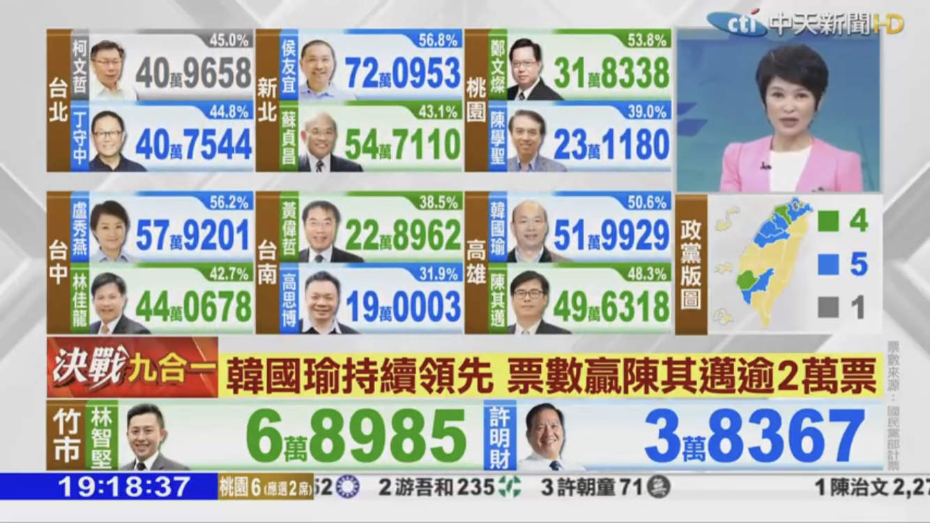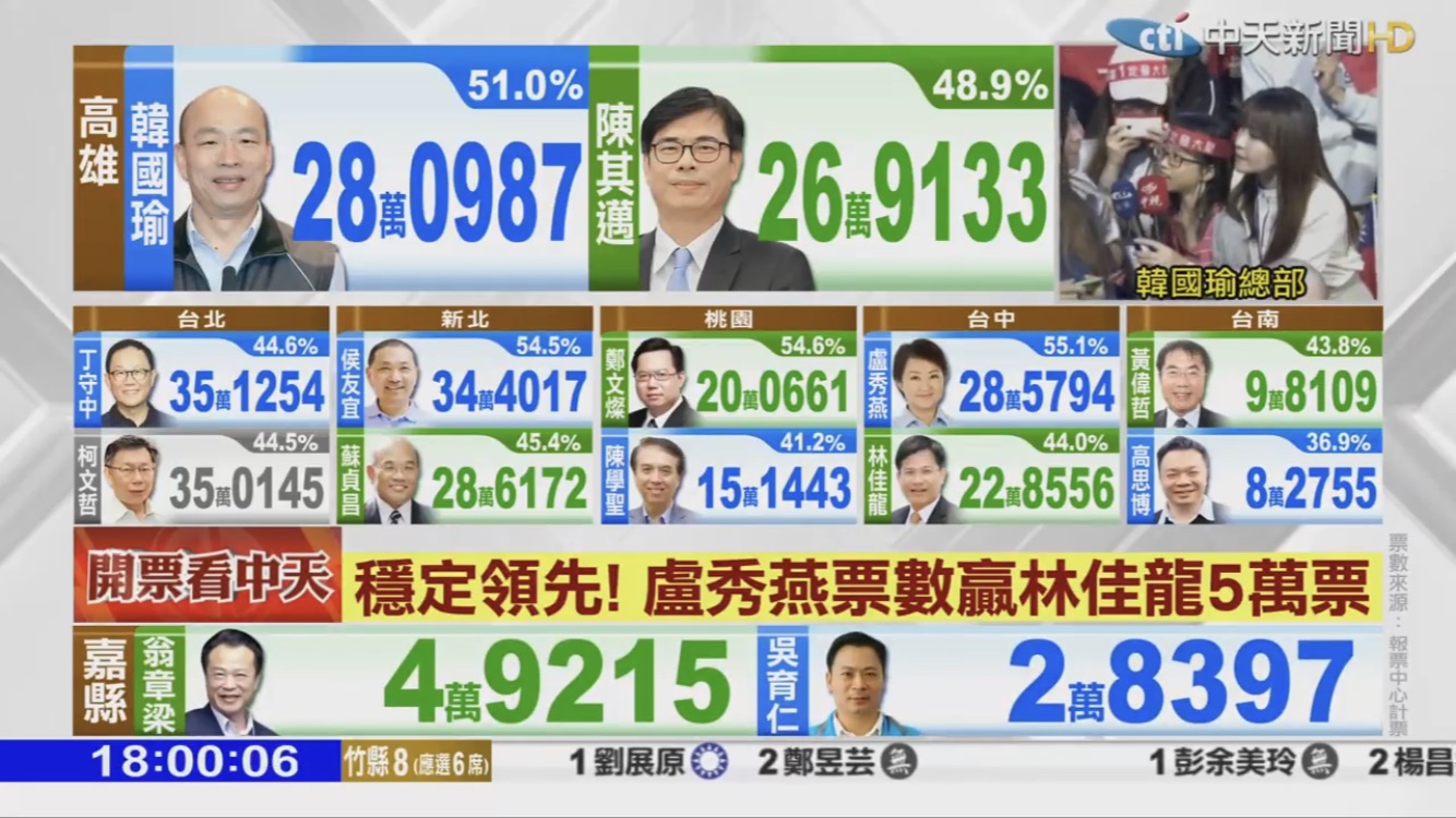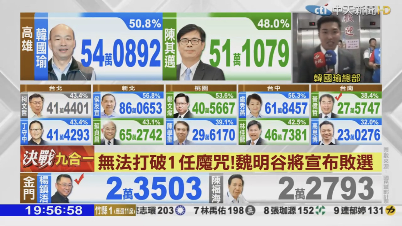 19:56分,韓國瑜領先3萬票,台中盧秀燕大勝林佳龍15萬票,林佳龍宣佈敗選,然而最焦灼的還是台北,柯文哲丁守中差距只有幾百票。