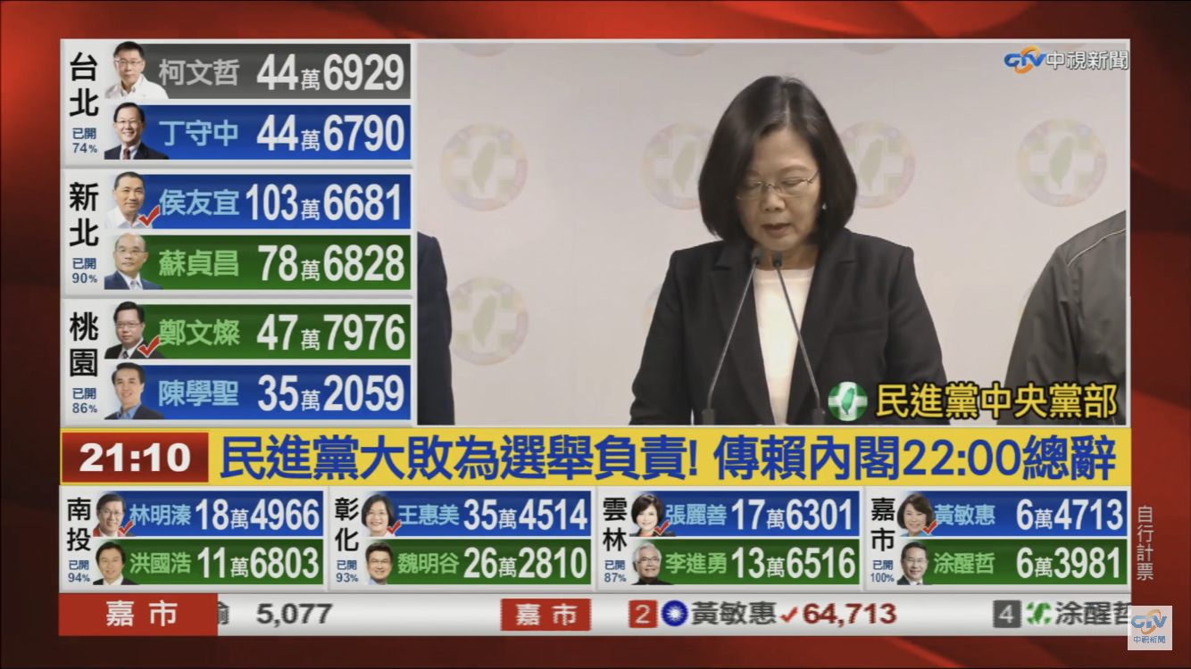 台灣九合一選舉正在開票,民進黨大敗,蔡英文請辭黨主席職務_風聞