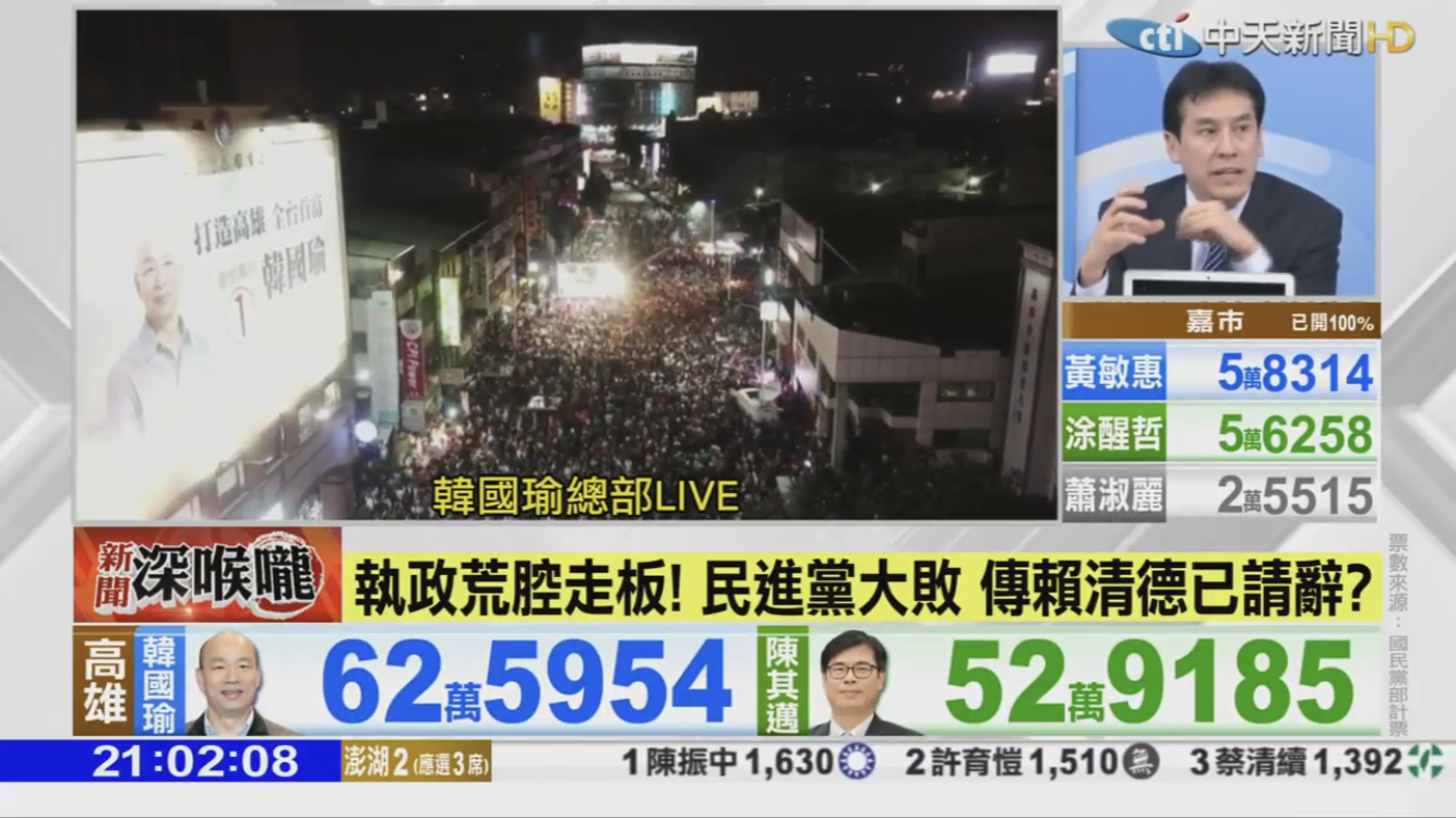 晚上九點鐘,韓國瑜62萬票對陳其邁52萬票,大勝將近十萬票,真的反轉了高雄,不知道蔡英文是否要辭職民進黨主席了