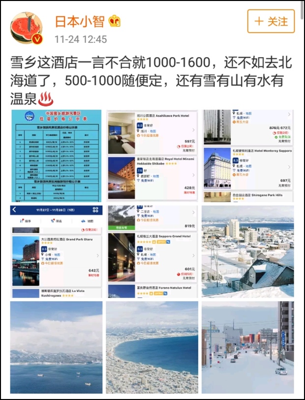 況且在此之前,社交媒體上已有不少營銷號放出美圖,鼓吹大家放棄雪鄉,前往北海道看雪。