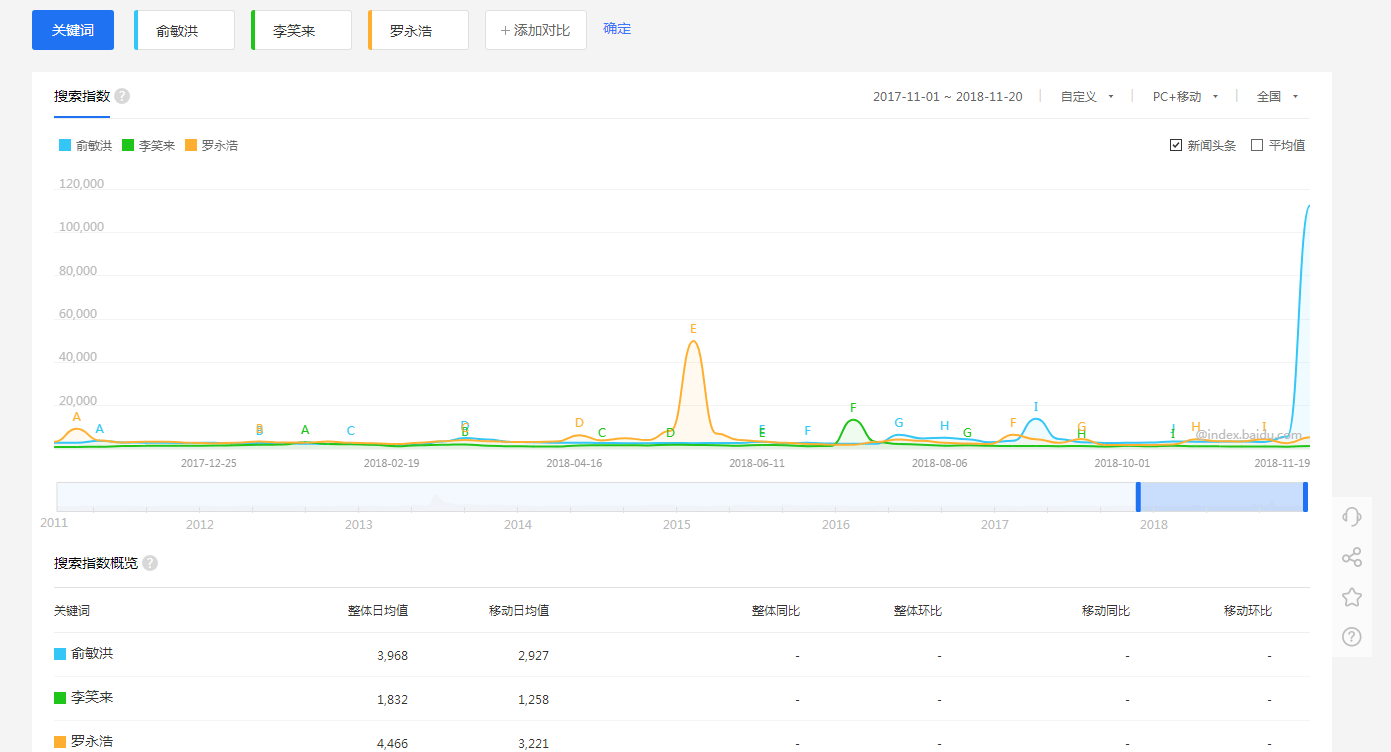 某種程度上看,這些驚人言論,讓俞敏洪備受關注——鋅刻度記者從百度指數查詢結果顯示,11月20日,俞敏洪搜索指數從過去一年整體日均值不到4000,猛漲到超過13萬,創造個人歷史最高紀錄。而過去一年中,他每一次的驚人言論後,搜索指數都短暫大幅波動。