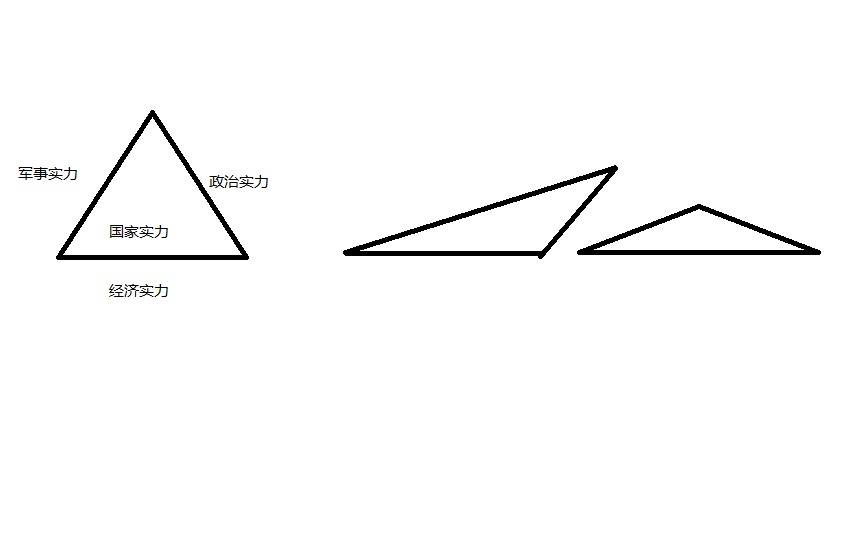 我認為在國家的實力中,組成的要素是經濟、政治和軍事實力,這三者的關係不是線性的,基辛格博士提出的實力是乘積關係就是一種線形的關係,也就是實力要素總是越大越好。我認為實力要素是存在着結構關係,這種關係我用一個三角形來表示,就是上面的圖。經濟實力是基礎,它與政治實力和軍事實力構成一個三角形的關係,三角形的面積就是國家的實力。這是一個定性化的概念模型。關於三角形,我們知道正三角形面積最大,三角形的兩邊之和必須大於第三邊。這些幾何的基本原理用到分析國際政治中的國家實力時就不僅僅要考察這些國家的各個經濟實力和軍事實力,而且要分析他們之間的結構合理性。好的實力結構會讓國家的資源發揮最大的實力效用。在上面的模型中,中間和右邊兩個三角形代表着結構失去均衡的實力結構。至於什麼樣的結構是均衡的實力結構,更接近正三角形?這是一個經驗性的分析,我認為軍費投資大約佔2%的時候,軍事與經濟的比例是最恰當的,在三角形中,經濟實力的邊長與軍事實力的邊長是相等的,這個時候,軍事與經濟是最佳配合,過低與過高的軍費投資對國家的實力都是有負面影響的。